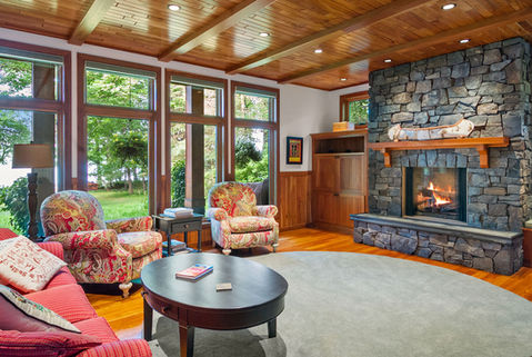 Pre-finished cedar siding with timber frame accents. Wood trims with custom fireplace. Builds include a house, boat house, sauna, detached garage, pergola, and three-season porch.